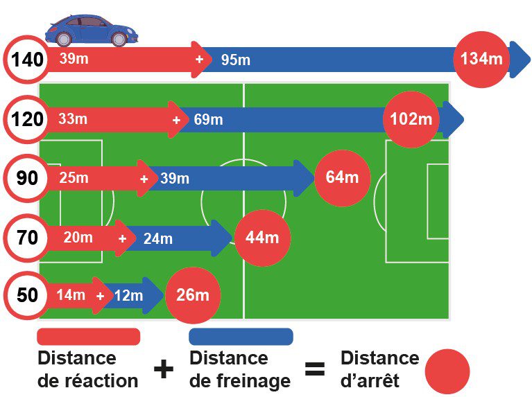 Si vous additionnez les deux, vous avez votre distance d’arrêt. Plus vous roulez vite, plus votre distance d’arrêt est longue !